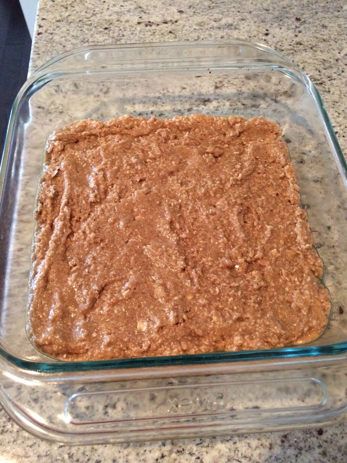 Melt chocolate with the 2 Tbsp of coconut oil. I used the microwave at 50% power for a minute and did additional 30 second intervals until it almost all melted and I could easily mix it together. Pour on top of the peanut butter later and smooth out. Bake for 18 minutes and cool on stove top.