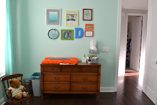 To the right of the door when you enter is the diaper changing area and dresser with photo collage above it. It is a mix of photos, printables, a mirror and a wooden painted letter. In the corner is a small trash can and the cloth diaper pail